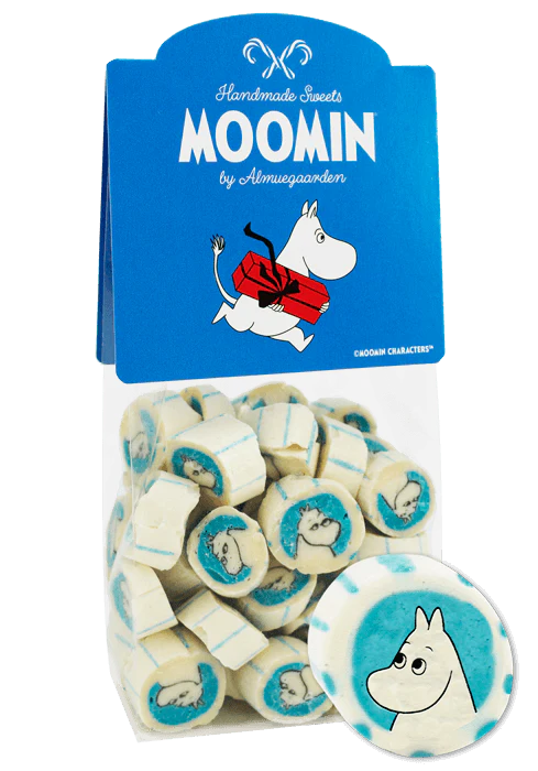 Disse Mumi bolcher er håndlavede i Danmark af det lille familiedrevne bolchekogeri Almuegaarden, ved brug af de bedste naturlige ingredienser, traditionelt dansk håndværk og med fuld respekt for Tove Jansonns originale Mumi illustrationer.
