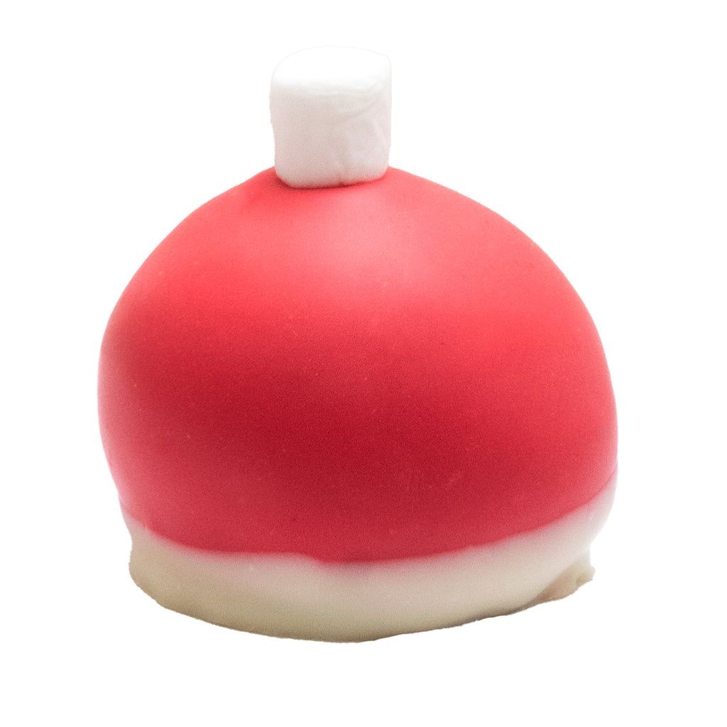 Denne festlige Jule Trøffel er forklædt som en nissehue og fyldt med uimodståeligt nougatknas. Overtrukket med rød chokolade og toppet med skumfidus.